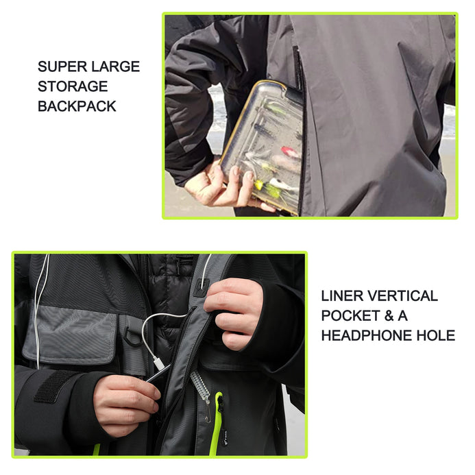 User Friendly Design: 8 Fans Waterproof Fishing Jackets for Men Women added a pocket on the left sleeve to store fish hooks, GPS and any small items. The Liner adds a headphone hole for freeing hands to make and receive calls while Fishing, Hiking etc. The Sleeves also have adjustable velcro to meet your needs when your fishing.
