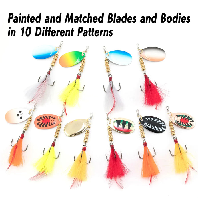 Made with high quality components including stainless steel shaft that is not easy to rust, brightly colored bell shape lure body, painted indiana blades, and sharp fish hooks.