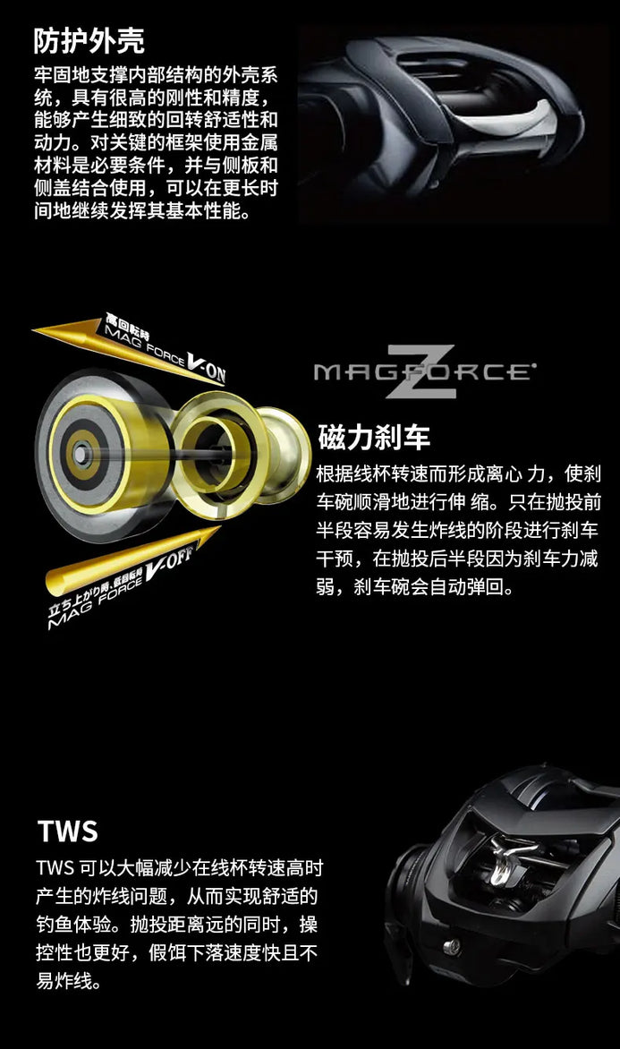 • SV Concept Spool + Air Rotation Brake – Utilizes a Super Duralumin spool and an inductive rotor to balance distance and brake control automatically/