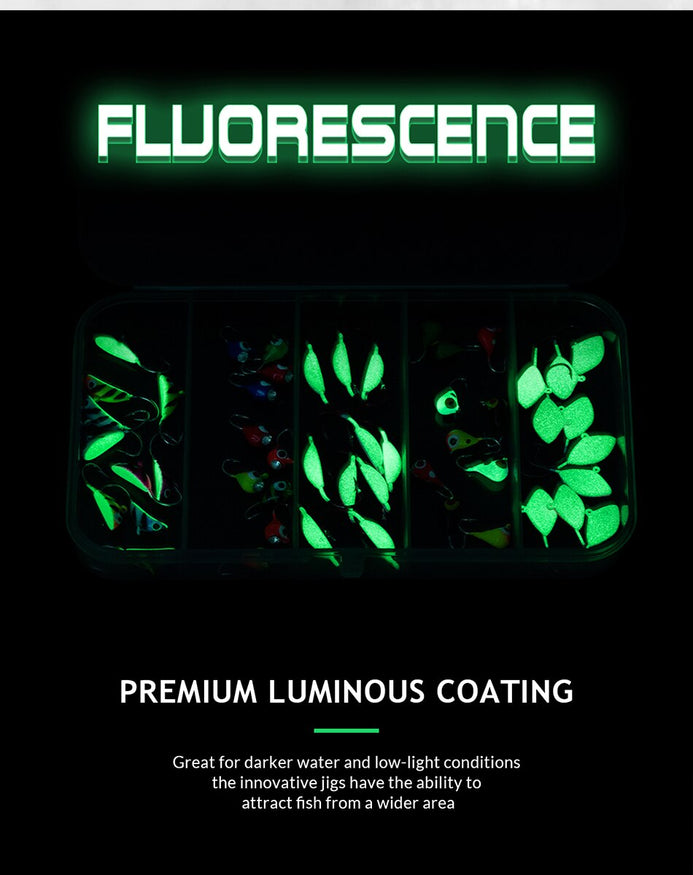 50PCS & 5 SHAPE STYLES: The 50PCS ice fishing jigs set contains 5 shapes,25 colors ice lures. The high fidelity premium paint coating will not come off easily, ensuring jigs durability while driving the target fish crazy with a variety of bright color patterns. Work with the ultra sharp barbed hook tip design to achieve higher hook-up rate.