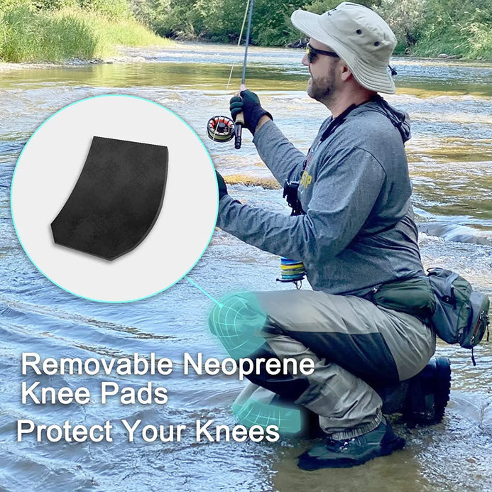 • 4.5mm STOCKING FOOT&REMOVABLE NEOPRENE KNEE PAD:8 Fans Wading Pants for men have Comfortable Waist-High Durable Neoprene Stocking foot which made of 4.5mm neoprene material, which are thicker than most others. Double-layer Kneepads and sturdy Stocking Foot are aimed at protecting you from scratch of gravel. The updated Fishing Pants have a Removable Neoprene Gasket that protect your knees.