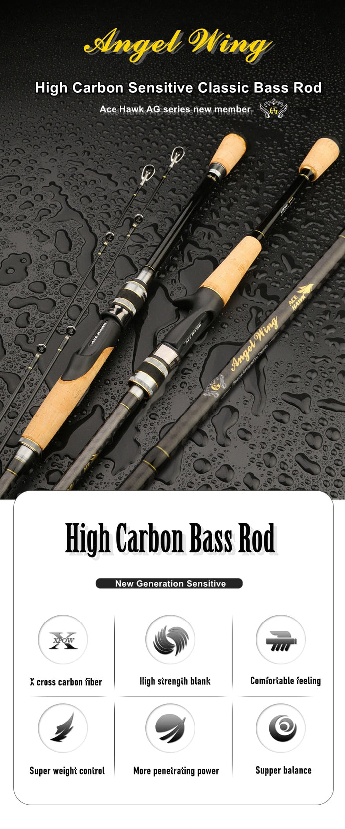 Ace Hawk Angel Wing Series Carbon 2PC Spinning/Casting Rod 1.98m/2.13m Fast MH