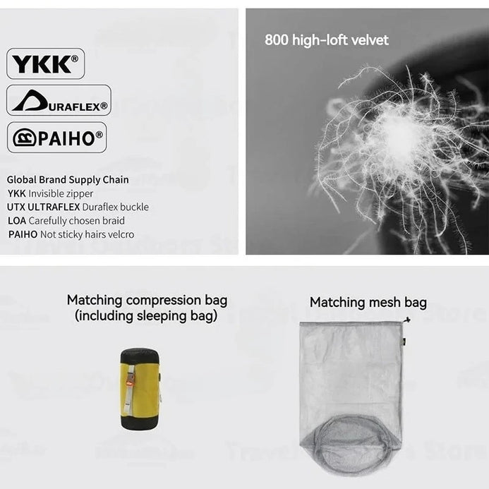 Lining:iFlex 7D Nylon SoftTouch | Draft baffle | Lining structure | Storage bag and compression sack included | Regular and Lengthen can be spliced