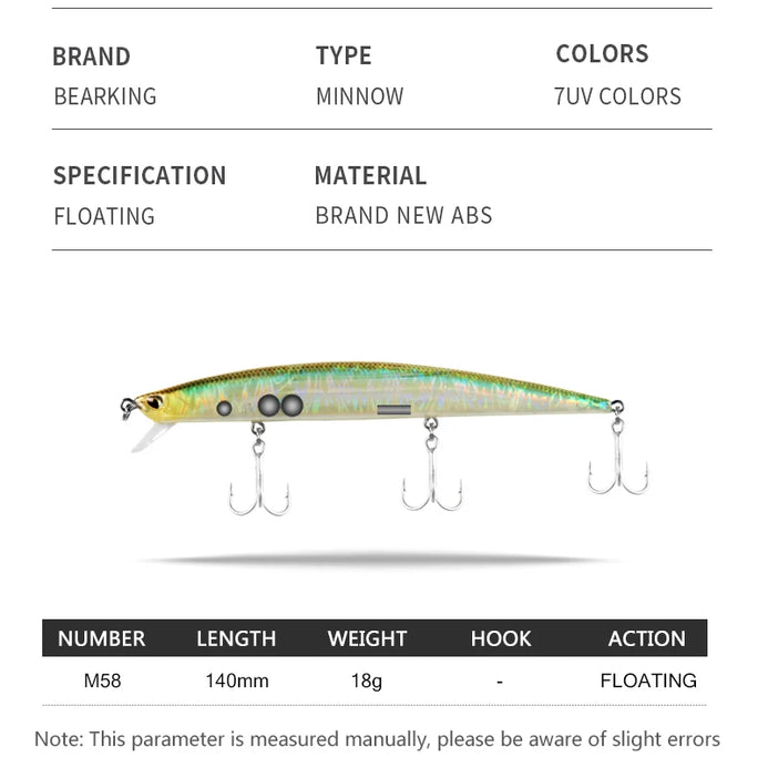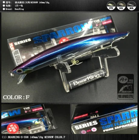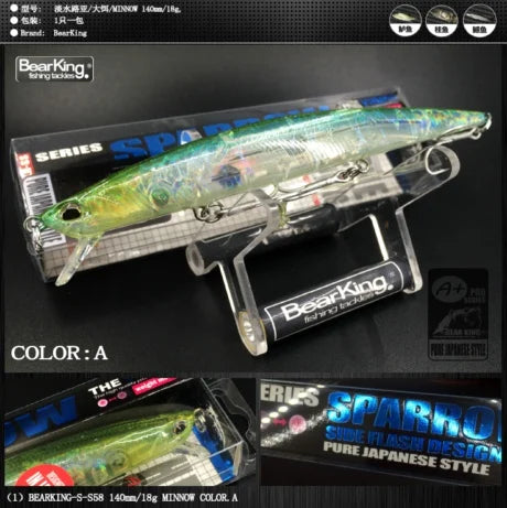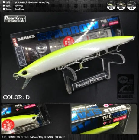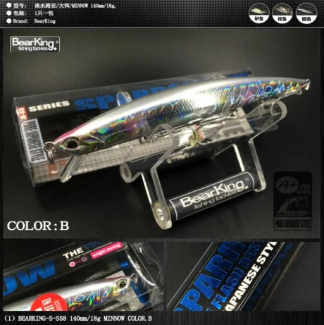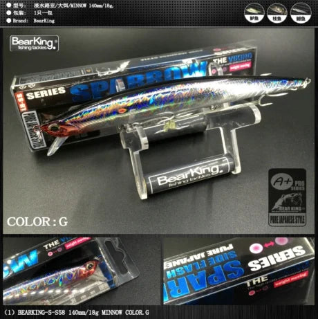 Introducing the BearKing 140F Pro Lipped Crank! This top-of-the-line lure boasts a 14cm length and 18g weight to attract big game fish. With its expertly designed lip, it creates an irresistible wobbling action that is sure to entice even the most elusive catches. Upgrade your fishing game with the BearKing 140F Pro Lipped Crank.