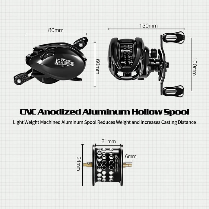 1. Hollow 9.8g Spool. only 6.6g bait finesse spool without short axis shaft. Precise carved shallow spool.