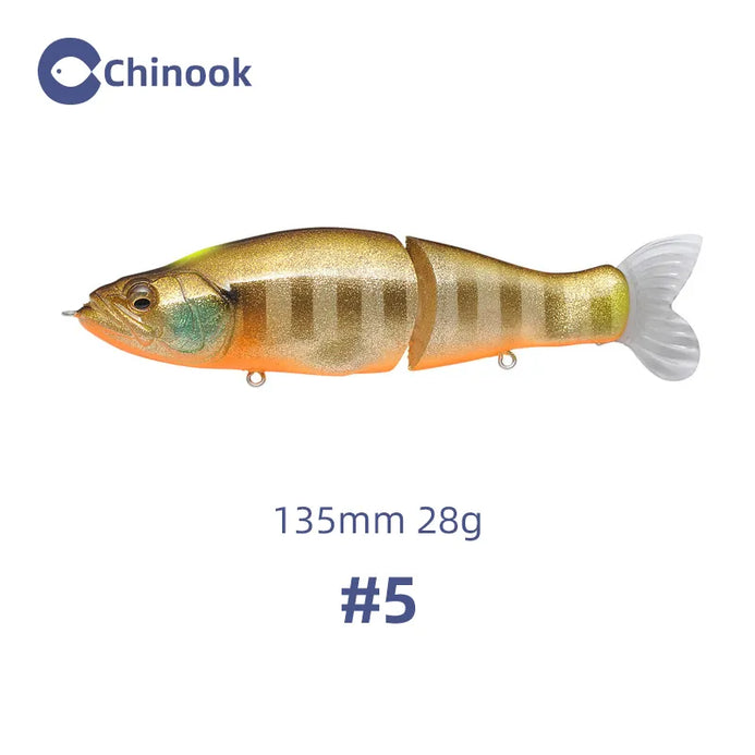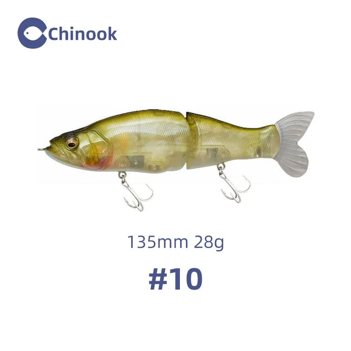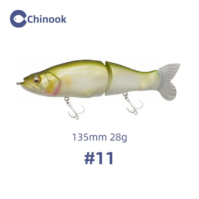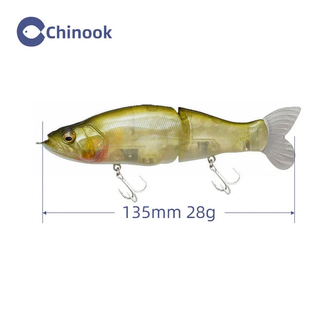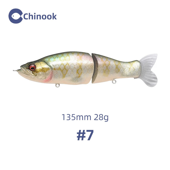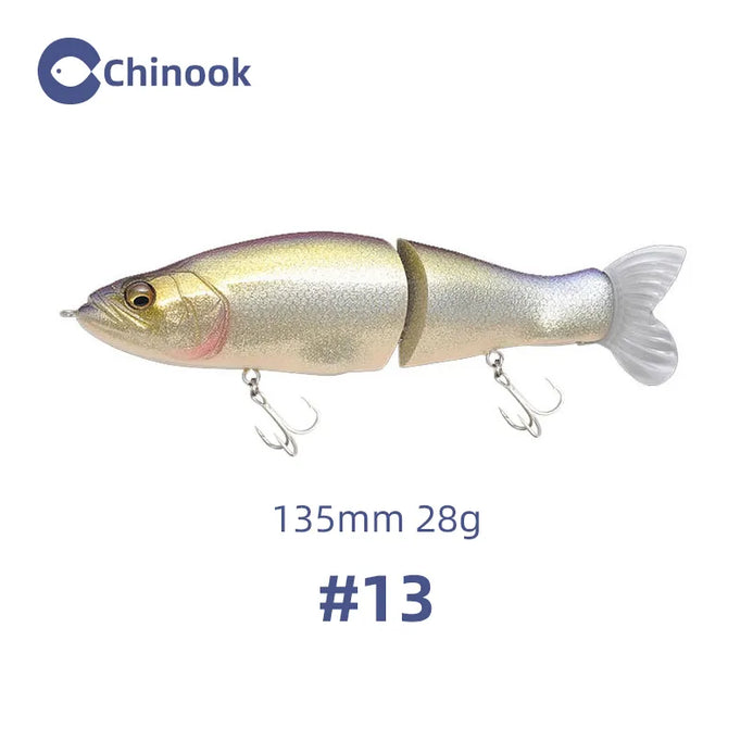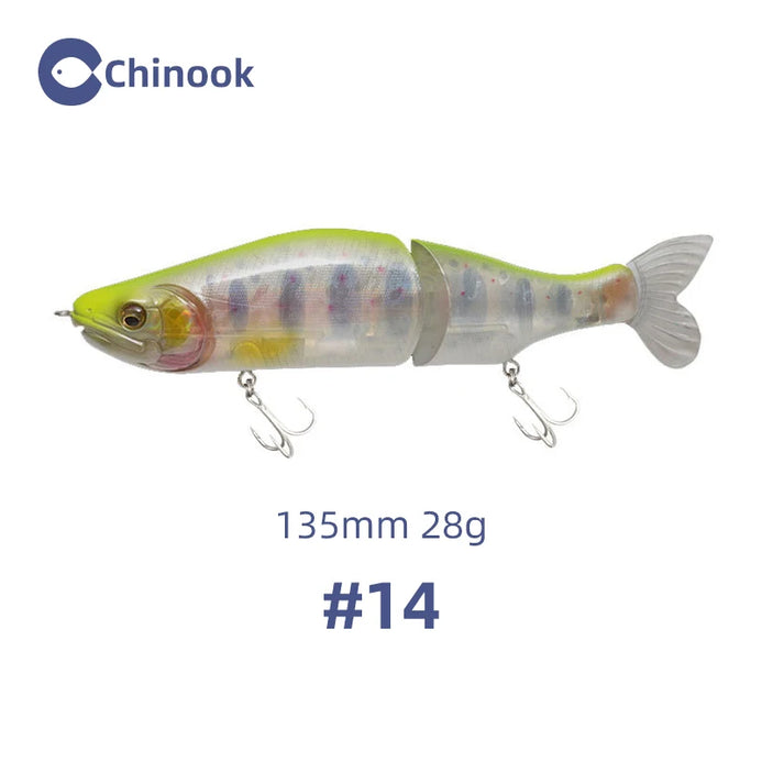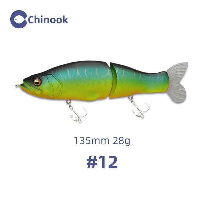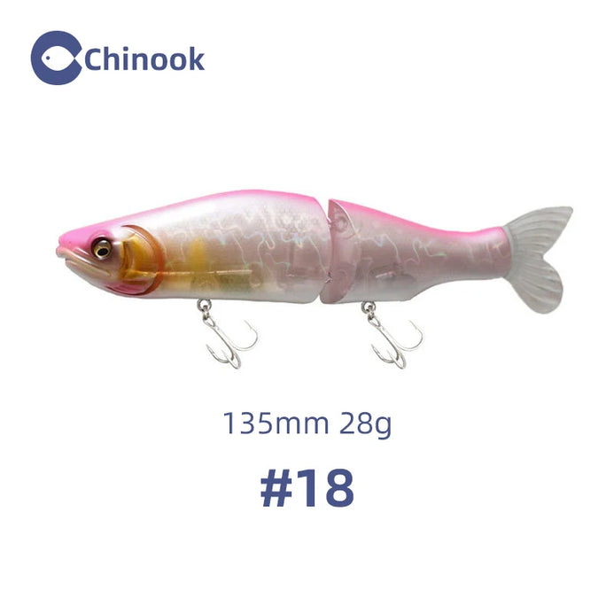 The Chinook Jointed Swimbait measures 135mm and weighs 28g, making it an ideal choice for anglers looking to catch bigger fish. This swimbait's jointed design adds a realistic touch to its swimming action, making it a great addition to any tackle box.