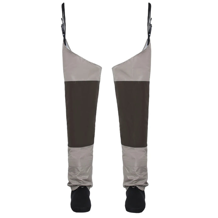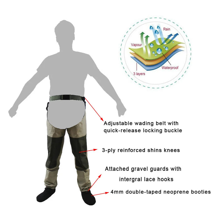 Designed for shallow wading, keeps you your lower legs dry from the foot to the knee . Made of Three-ply waterproof and breathable fabric with a laminate upper, provides flexibility and durability for all day walking and wading comfort. Interior built in cinch strap just below the knee provides a secure fit and prevents water from entering the foot area while wading or hunting. 4-mm neoprene stocking foot bed; easily fits into your wading boots with built-in gravel guards. Versatile uses, great for hunting in marshes or tall grass, keeps feet and legs dry, great for john boats, kayaks, canoes and drift boats too!