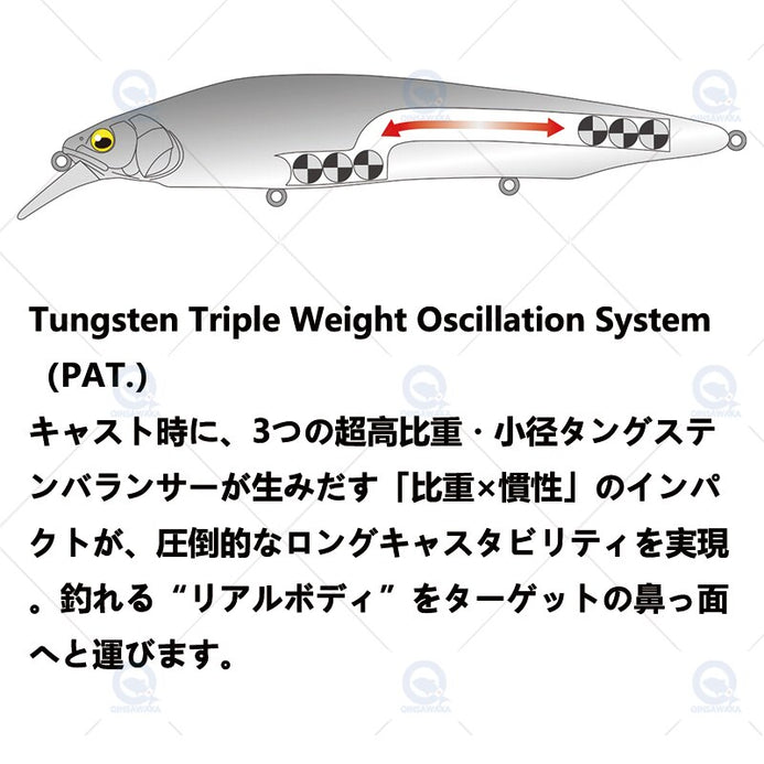 High impact jerkbait KANATA SW is most effective when target fish are focused on large baitfish such as Konoshiro. Despite its larger body, KANATA SW offers manageable retrieve resistance, allowing for high speed search applications without overtiring. Straight retrieve provides high pitch rolling action, activating large flat-side body with massive flashing appeal.