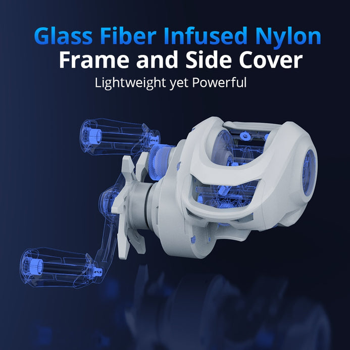 • LIGHTWEIGHT – Weighing in at only 7.6 ounces, the Centron Lite Baitcasting Reel has a narrow, Glass Fiber infused Nylon frame that is ultra-light and ultra-powerful. The compact size low profile baitcaster fishing reel is ergonomically designed for comfort.