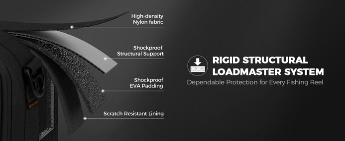 • Rigid Structural Loadmaster System: Constructed from high-density nylon fabric, complemented by a shockproof structural support, shockproof EVA padding, and scratch resistant lining, this system ensures formidable protection and significant load-bearing capacity. Incorporating tough, water-resistant materials ensures your fishing reels remain dry and safeguarded against the elements.