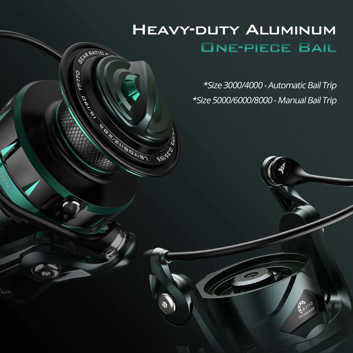 AERO-SPACE QUALITY GEARS: Best-in-class HRB 90 high strength aerospace alloy pinion gear with manganese brass gear guarantees extreme durability and smooth operation. These heavy-duty gears are 20% more durable than Aluminum and 95% more durable than zinc alloys. And the high-capacity CNC aluminum spool has a braid-ready structure, so there’s no need to add mono backing when spooling braided line. Plus, the seamless one-piece bail will never get rusted or caught on fishing line.