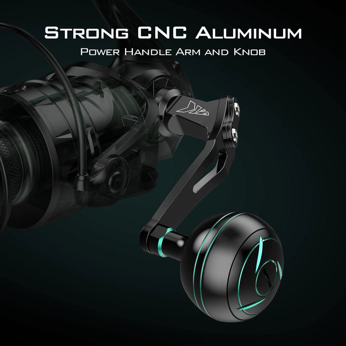 SUPER STRONG ALUMINUM BODY: Max-strength CNC aluminum frame construction. Sizes 3000/4000 have a carbon fiber rotor for strength with reduced weight. Sizes 5000/6000/8000 offer a CNC Aluminum Rotor for extra-strength in fishing. The large power handle and knob are machined from solid aluminum to provide incredible cranking power. This spinning reel has the strongest overall design for offshore sport-fishing, deep-sea game fishing, and blue water fishing. Great for monster fish in freshwater also