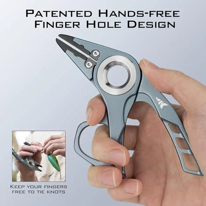 The finger hole is designed to keep your hands free to tie knots while the pliers dangle from your finger, then you simply swivel the pliers into your palm to cut your tag ends.