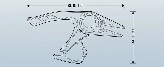 • Key Features – Patent pending design – Integrated finger hole keeps your hands free - Highly corrosion resistant T6061 Aluminum - Tungsten carbide line cutters cut through mono, fluorocarbon, and braided fishing line with ease – Quick access sheath design attaches to belt clip or arm band.