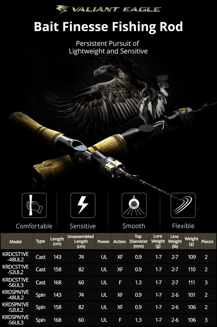KastKing Valiant Eagle Carbon Fiber BFS Casting/Spinning Stream Rod 1.43-1.68m 2/3PC UL 30T Carbon Fiber