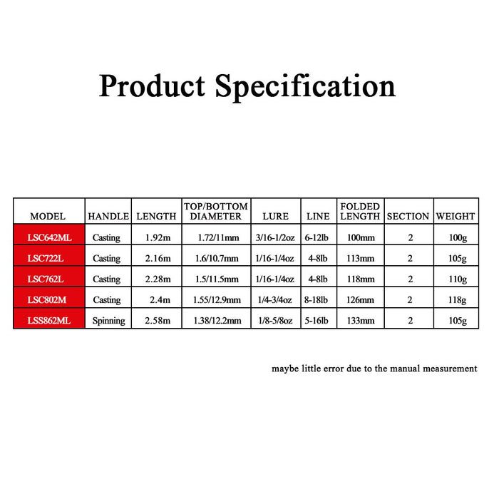 Lure:1/16-1/4oz(1.8-7g)  Line:4-8lb   Medium Fast Action ; L(Light)