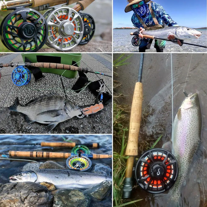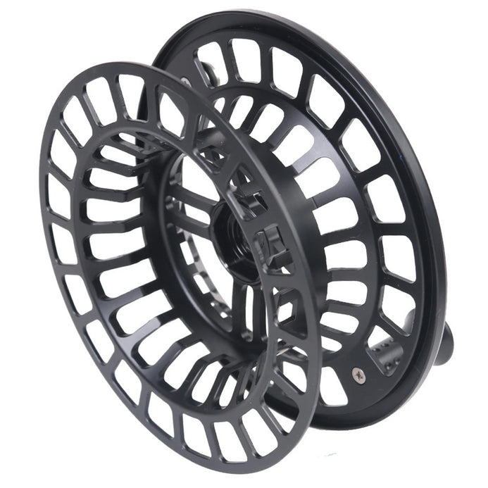 Beveled cut with a multi-axis machining technique from T6061 aluminum barstock provide enhanced engineering strength without additional weight. Hard anodized finishing for long time saltwater usage.  Patent-pending Maintenance-Free, fully Sealed Stacked Disc Drag System (MAX SDS). Carbon ,Cork and Stainless Steel Drag Discs - offer the power to battle angry fish while providing a smooth turning drag.  Large arbor spool for swift line retrieval and easy no-tools needed left and right hand retrieval change and a tippet holder on the spool balance to keep the loose end not tangled on the move.