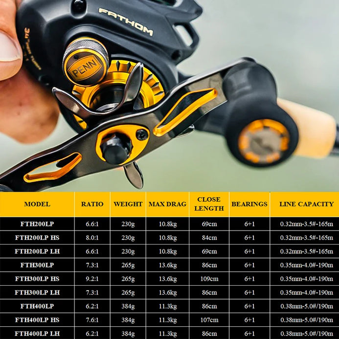 PENN FATHOM Low Profile Baitcast Reel 6+1BB 9.2/7.3/6.6 Ratio 10.8-13.6Kg Max Drag