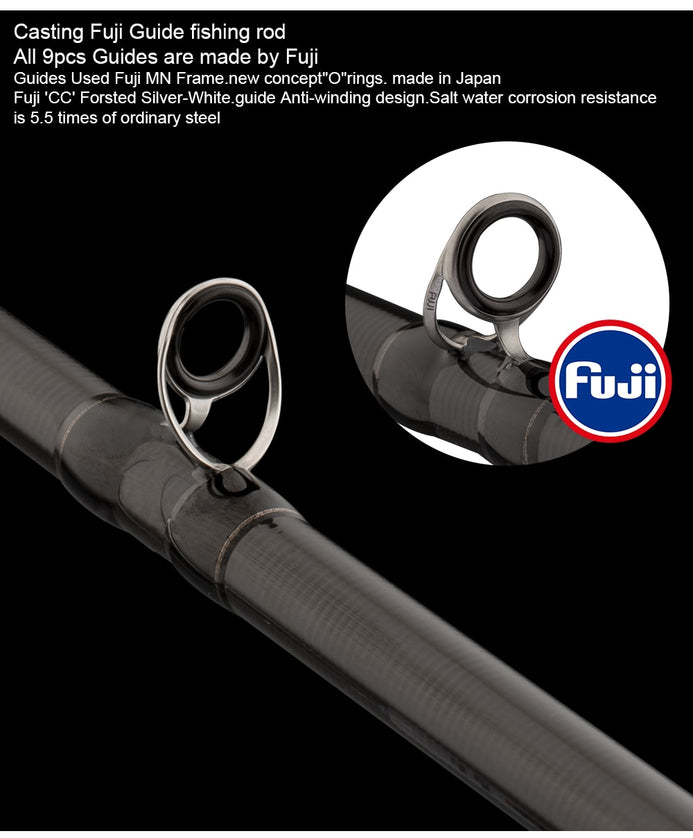 Casting Fuji Guide fishing rod. All 9pcs Guides are made by Fuji Guides Used Fuji MN Frame.new concept"O"rings. made in Japan. Fuji 'CC' Forsted Silver-White.guide Anti-winding design.Salt water corrosion resistance is 5.5 times of ordinary steel