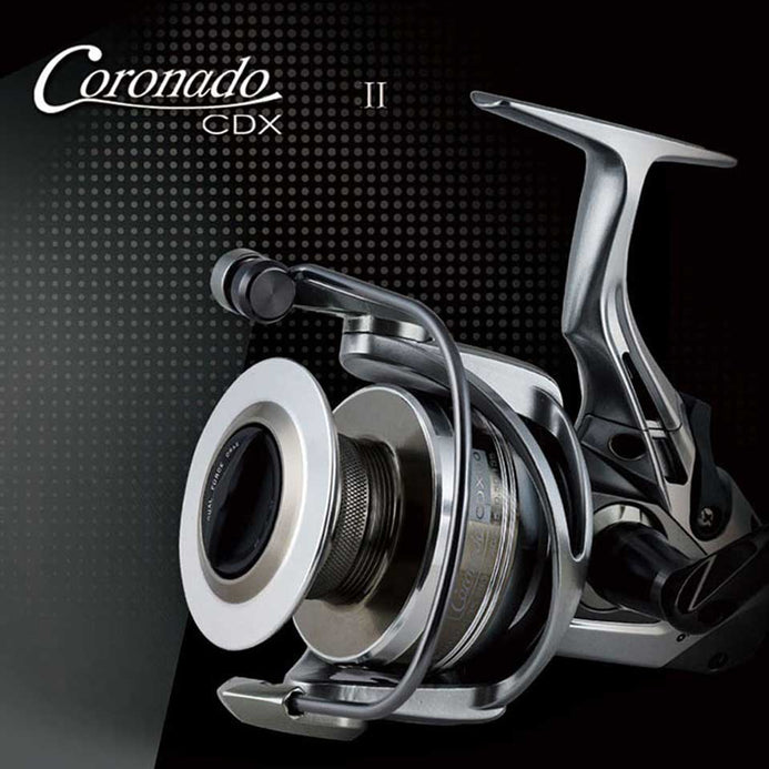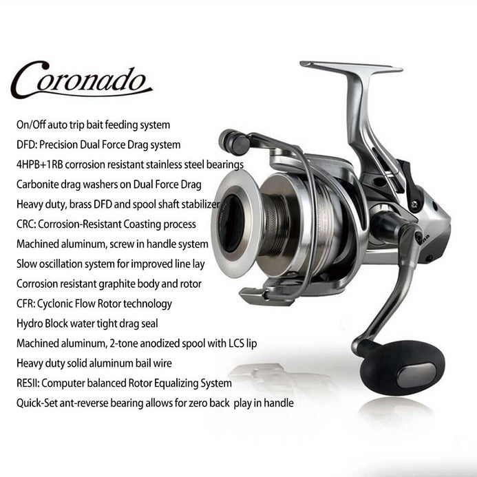 Okuma Coronado CDX Baitfeeder spinning reels feature on/off auto trip bait feeding system allows anglers to disengage their spinning reel spool and allow their bait to run freely. The precision dual force drag system and carbonite drag washers maximize high-end drag pressure, efficiency and overall smoothness. Slow Oscillation System can improve line lay. The reel is ideal for saltwater fishing. On/Off auto trip bait feeding system DFD: Precision Dual Force Drag system. Carbonite drag washers on Dual Force Drag. Heavy duty, brass DFD and spool shaft stabilizer4HPB+1RB corrosion resistant stainless steel bearings. Quick-Set ant-reverse bearing allows for zero back play in handle. CRC: Corrosion-Resistant Coasting process. Machined aluminum, screw in handle system. Slow oscillation system for improved line lay. Corrosion resistant graphite body and rotor. CFR: Cyclonic Flow Rotor technology. Hydro Block water tight drag seal. Machined aluminum, 2-tone anodized spool with LCS lip. Heavy duty solid aluminum bail wire. RESII: Computer balanced Rotor Equalizing System. Model - CDX-65