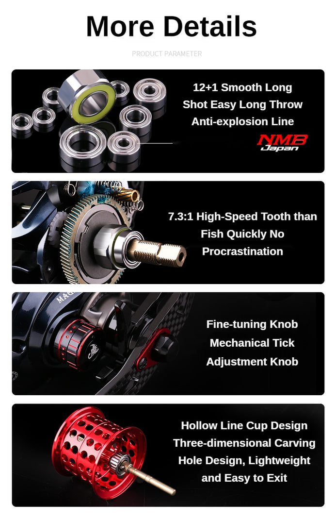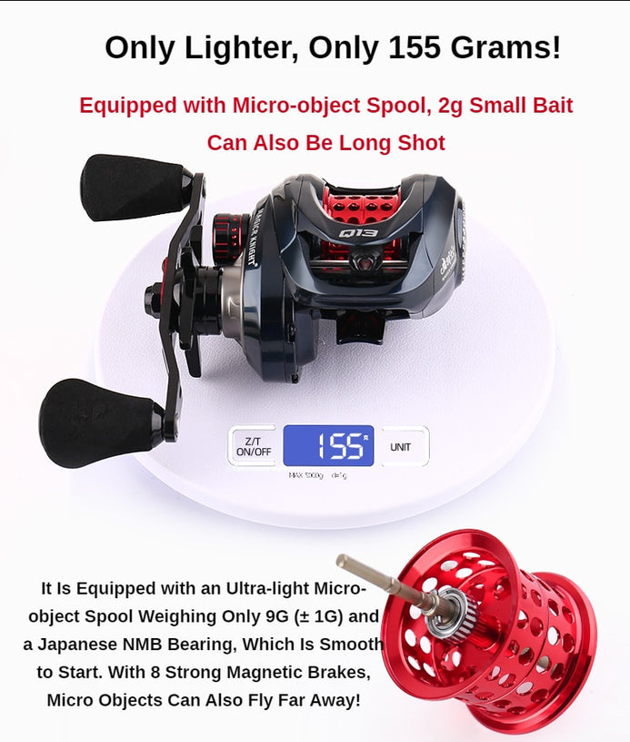 5. Equipped with micro-object spool, 2g small bait can also be long casted. It is equipped with an ultra-light micro-object spool weighing only 9G (± 1G) and a Japanese NMB bearing, which is smooth to start. With 8 strong magnetic brakes, micro objects can also fly far away!