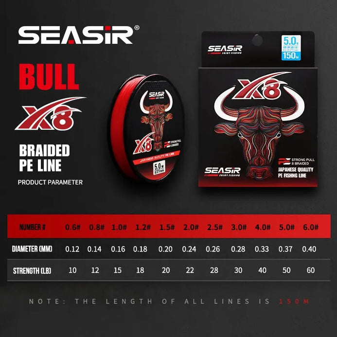 Seasir RedBull 8 Braid Pe Fishing Line 150M 0.8-5.0 12-50LB