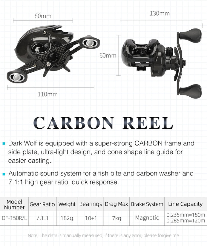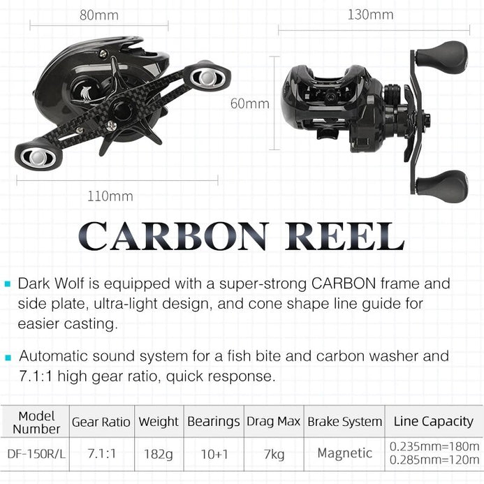 Unleash the power of the Tsurinoya DARK WOLF Baitcasting Reel. With a 7.1:1 gear ratio and 7KG max drag, this reel is built for speed and strength. Weighing in at just 182g and featuring 10+1BB, it's the perfect combination of lightweight and durability. Catch more fish with the DARK WOLF!