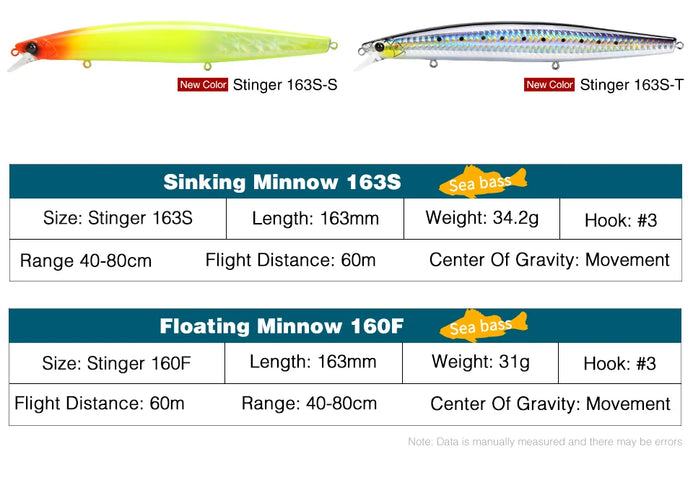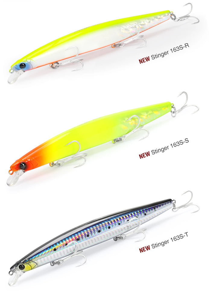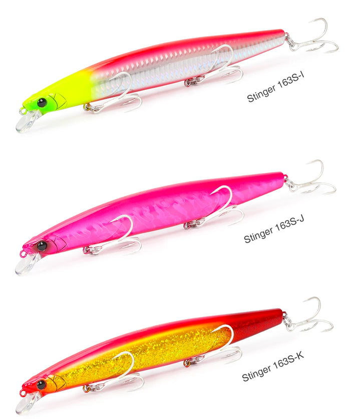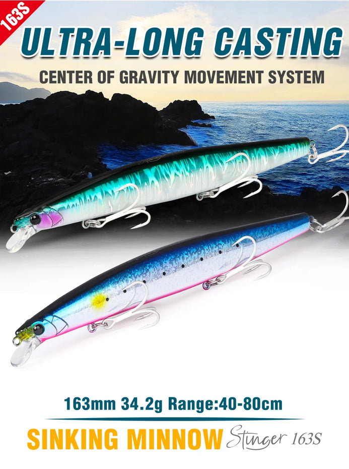 • STINGER 163S / 163mm / 34.2g / Range: 40-80cm / Center Of Gravity Movement System / Flight Distance about 60m / Hooks: #3*3 / 20colors