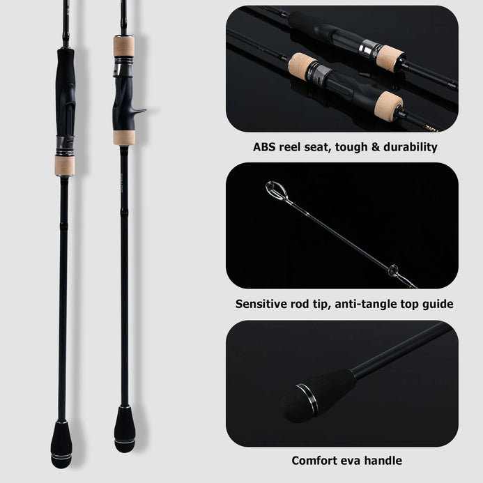 4. One and a half plug-in sections are convenient to carry and maintain the overall characteristics of the fishing rod to a greater extent. 5. ABS wheel seat, high hardness, sturdy and durable, with strong adhesion