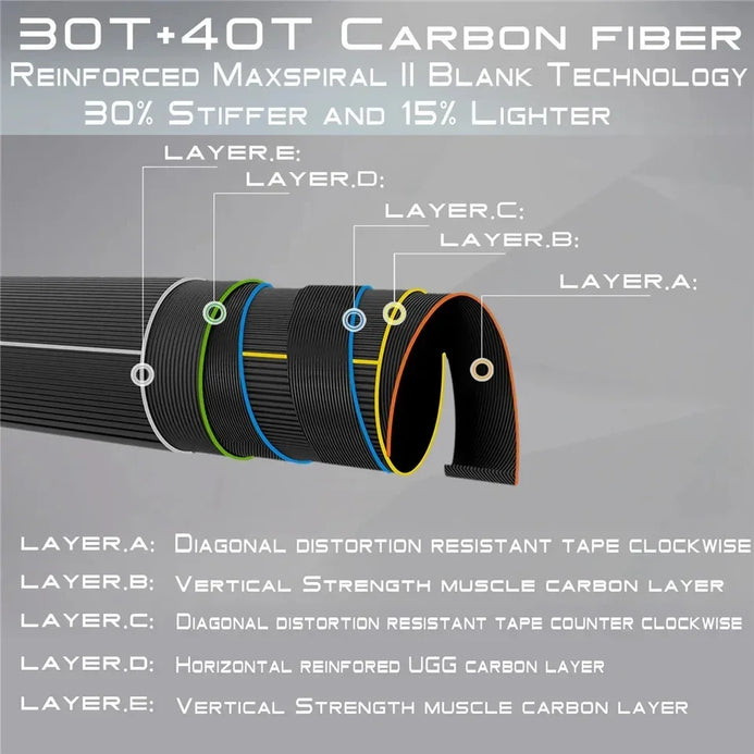 --EXCLUSIVE MAXSPIRAL BLANK TECHNOLOGY - Pure 30T mixed 40T carbon fiber. With mixed 5 layers of carbon including Reinforced Muscle carbon layer for at least 30% increase in stronger and 15% lighter. We use top High Modulus carbon to make a very strong and durable rod.