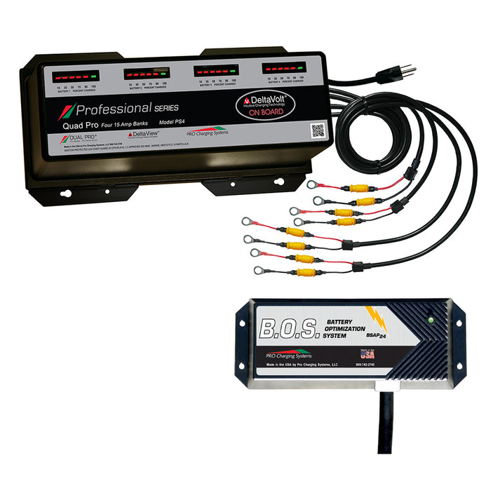 This kit includes Dual Pro’s B.O.S. Battery Optimization System - 12V - 2-Bank (PN: BOS12V2) and Dual Pro’s Professional Series Battery Charger - 60A - 4-15A-Banks - 12V-48V (PN: PS4).