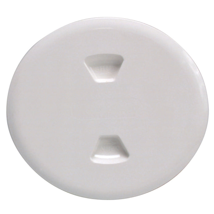 The Beckson Twist-out Deck Plate is designed to conceal its mounting fasteners under the quick twist cover. The low profile cover is self-centering, and quickly locks in place with a 1/8 twist. Three seperate sealing areas, each designed to chase water away from the plate opening, assure a watertight closure. The bayonet threads are non-jamming, self-cleaning and lift at the center for easy removal.