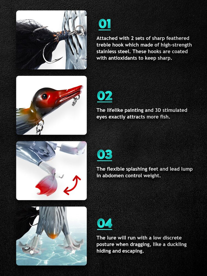 1. A super realistic Duckling top water imitation lure loaded with innovative features! The 3D Scanned details will fool even the most wary predator fish and ensure you brutal attacks!