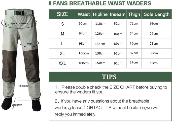 5 SIZES AVAILABLE:To meet the diverse needs of customers, our new update Fishing Waist Waders came into being. Attention: the size of the waders are manually measured, errors exist in all measuring. In order to get the suitable Pant Waders, please help send us your questions by email before purchasing.Please choose a slightly wider size Wader to have more space to wear clothes.