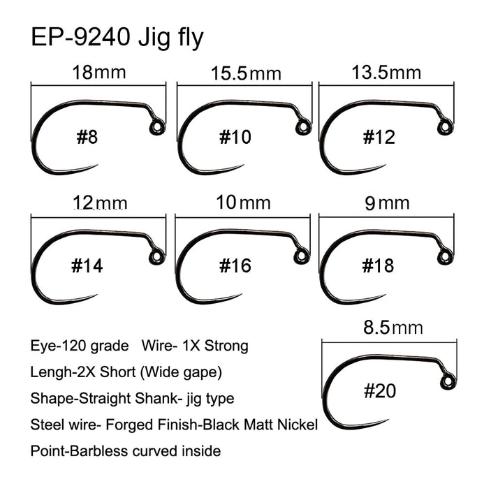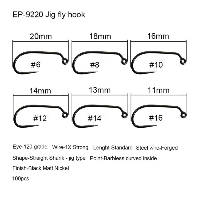 Jig fly hook straight point, EP-9220; Round bend, jig eye, standard length, standard wire, black nickel finish; Available sizes 8#, 10#, 12#, 14# and 16#.