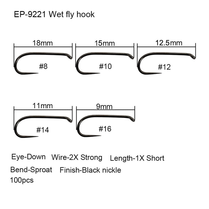 Wet fly hook, EP-9221; Down Eye, 2X strong wire, 1X short length, sproat bend, Black nickel finish; Available sizes 8#, 10#, 12#, 14# and 16#.