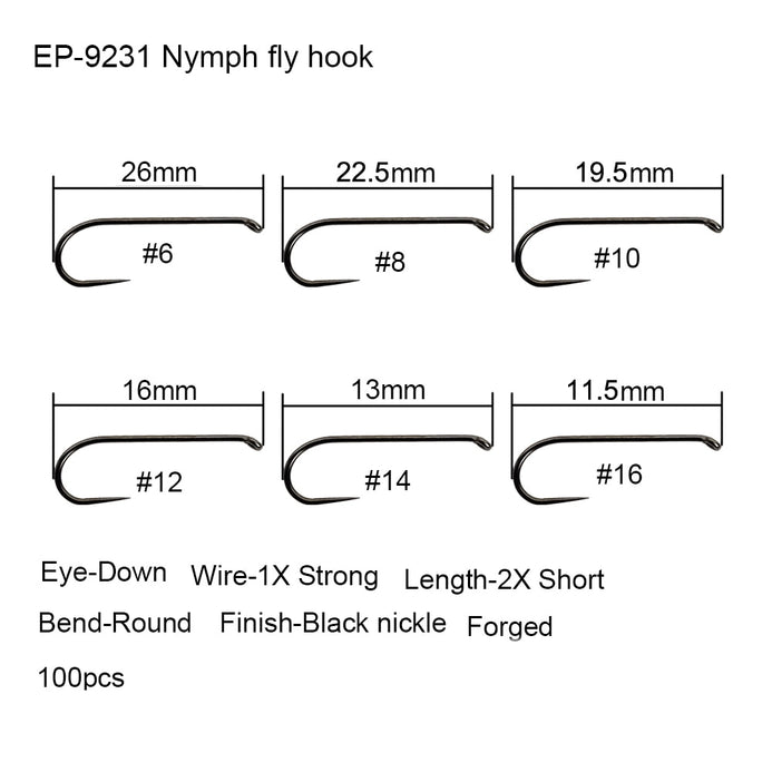 Nymph fly hook, EP-9231; Down Eye, 1X strong wire, 2X long, Round bend, Forged, Black nickel finish. Available sizes 6#, 8#, 10#, 12#, 14# and 16#.