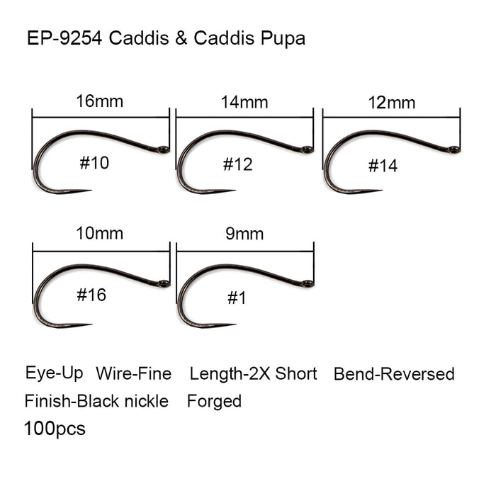 Pupa fly hook & Larva, EP-9254; Up Eye, Fine wire, 2X short length, Reversed bend, Forged, Black nickel finish; Available sizes 10#, 12#, 14#, 16# and 18#.