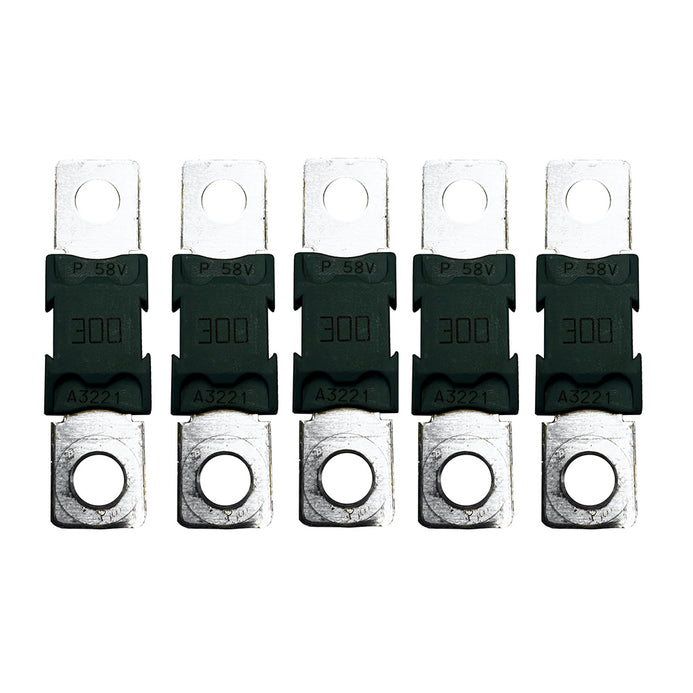 Victron Energy's MEGA fuses are frequently used in Victron Energy DC distribution systems. This particular pack of Victron MEGA fuses contains five 300 amp fuses.