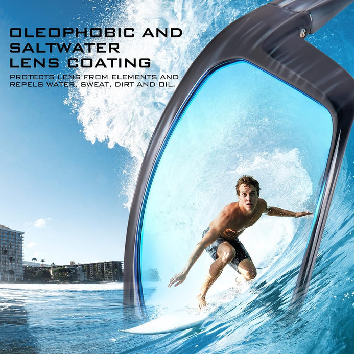 KEY FEATURES – Oleophobic lens coating repels saltwater, oil, and chemicals - Polarized lenses reduce glare - Impact resistant TAC lenses protect your eyes from flying objects - Block 100% of the harmful UVA and UVB rays - Lightweight, durable, and comfortable Grilamid frames – 30 Day Money Back Guarantee