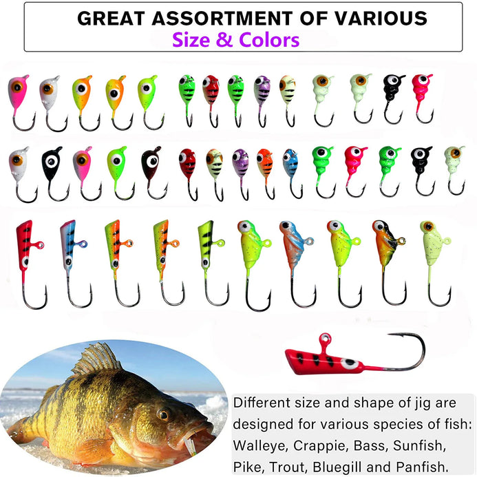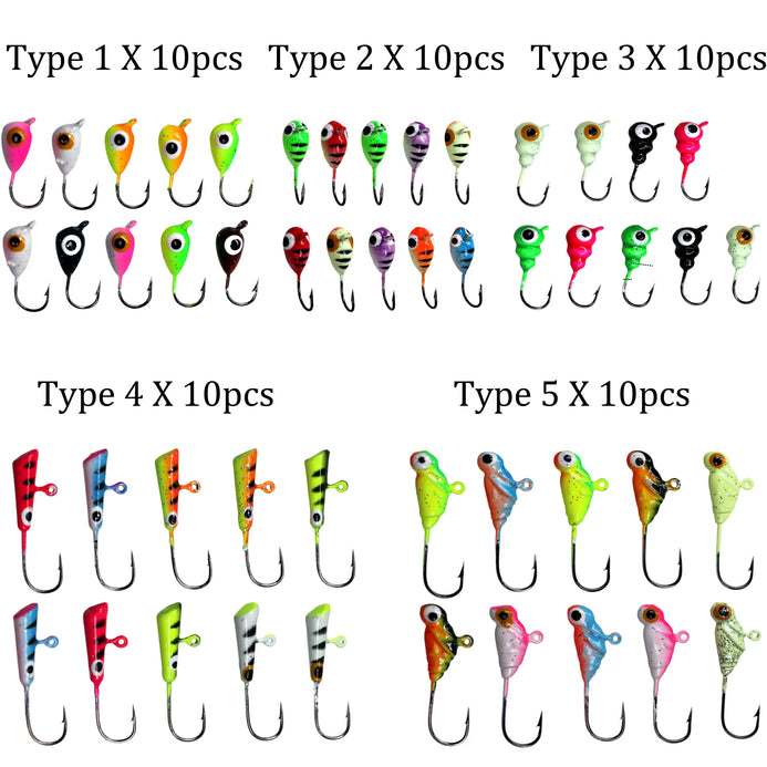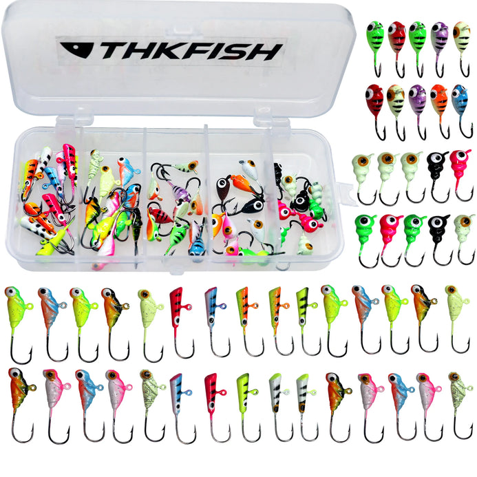 THKFISH 50 Pcs/Box Winter Ice Fishing Jig Set 1.3g-1.8g