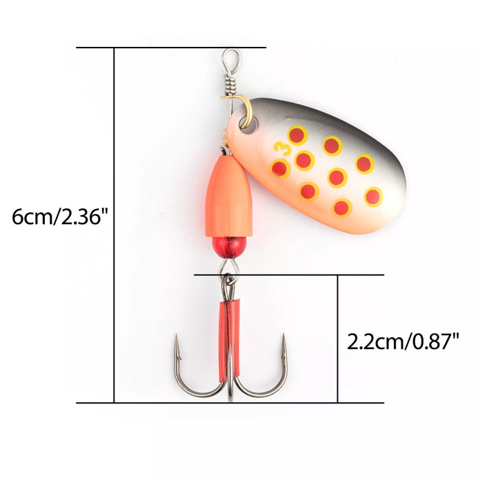 Made with high quality components including stainless steel shaft that is not easy to rust, brightly colored bell shape lure body, painted indiana blades, and sharp fish hooks.