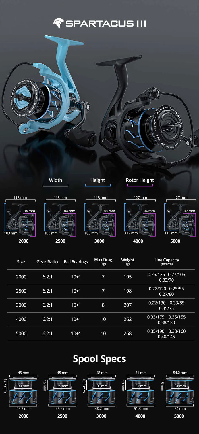 Introducing the KastKing Spartacus III Spinning Reel! With a powerful 7-10KG max drag and 6.2:1 power ratio, this lightweight 195g reel is perfect for any angler. Its smooth, high-quality performance will help you reel in your biggest catches with ease. Upgrade your fishing game today!