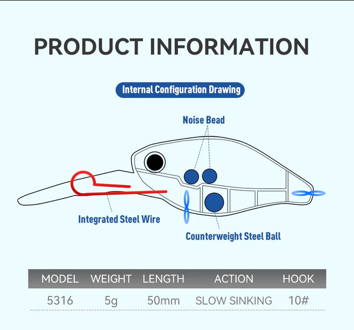 5g slow-sinking design for easy operation, making it easy for both beginners and veterans to catch fish! Available in 6 colors, each one is a guaranteed hit!