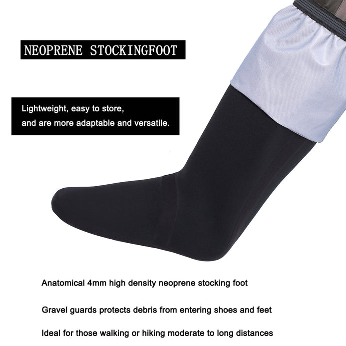 Comfortable stocking foot Breathable waders with adjustable suspenders, handwarmer pocket and attached gravel guards.