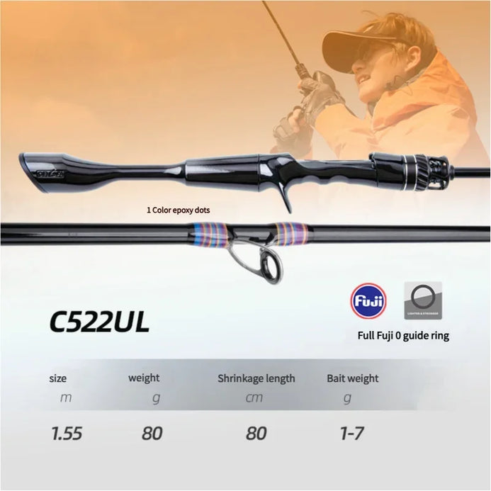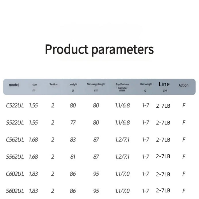 Type: Casting | Length: 1.5m | Closed Length: 0.80m |Weight: 77g | Section: 2 | Top Diameter: 1.1mm |  Bottom Diameter: 6.8mm | Lure Weight: 1-7g /Line Weight: 2-7lb