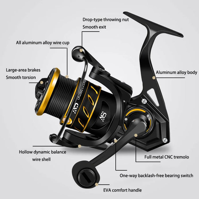 Model:5000| Gear Ratio:5.1:1| Weight: 358g | Bearings: 5+1BB | Max Drag: 10KG | Line Capacity: 0.14mm-220M 0.16mm-200M