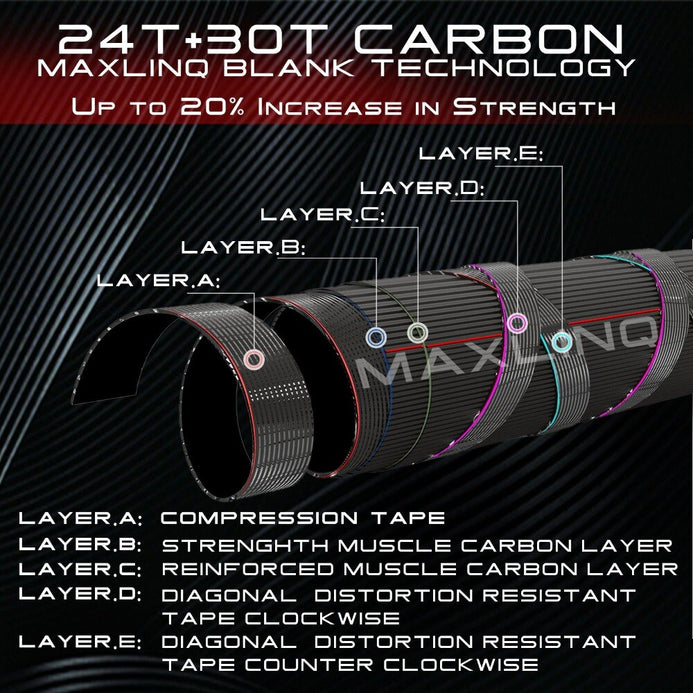 EXCLUSIVE MAXLINQ BLANK TECHNOLOGY –Pure IM7 24T plus 30T carbon fiber. With mixed 5 layers of carbon including Reinforced Muscle carbon layer for at least 20% increase in strength. The high performance blank will prove the quality is not only associate with high dollar price tags, the highest performance to price ratio.