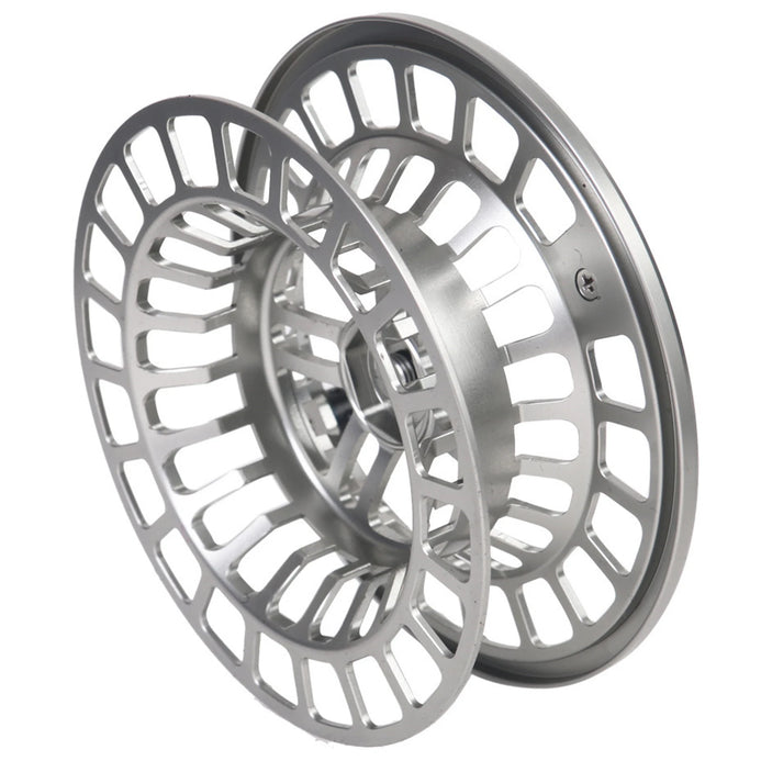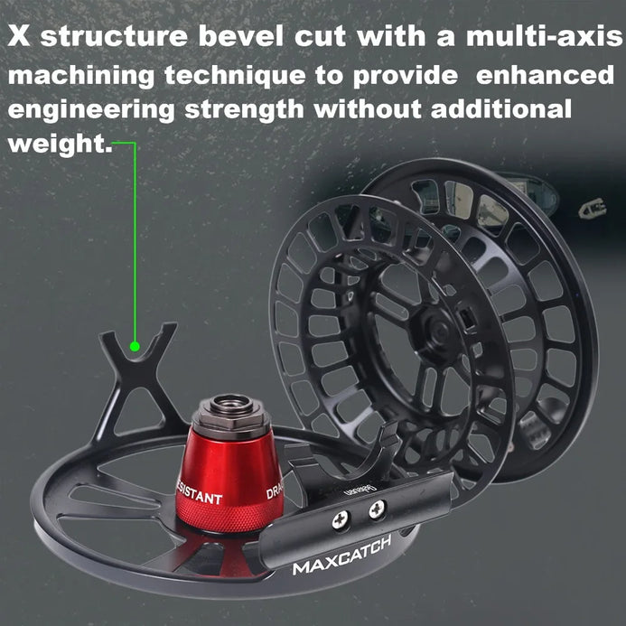 Beveled cut with a multi-axis machining technique from T6061 aluminum barstock provide enhanced engineering strength without additional weight. Hard anodized finishing for long time saltwater usage.  Patent-pending Maintenance-Free, fully Sealed Stacked Disc Drag System (MAX SDS). Carbon ,Cork and Stainless Steel Drag Discs - offer the power to battle angry fish while providing a smooth turning drag.  Large arbor spool for swift line retrieval and easy no-tools needed left and right hand retrieval change and a tippet holder on the spool balance to keep the loose end not tangled on the move.