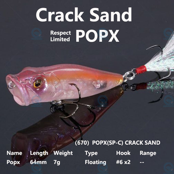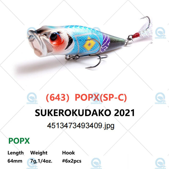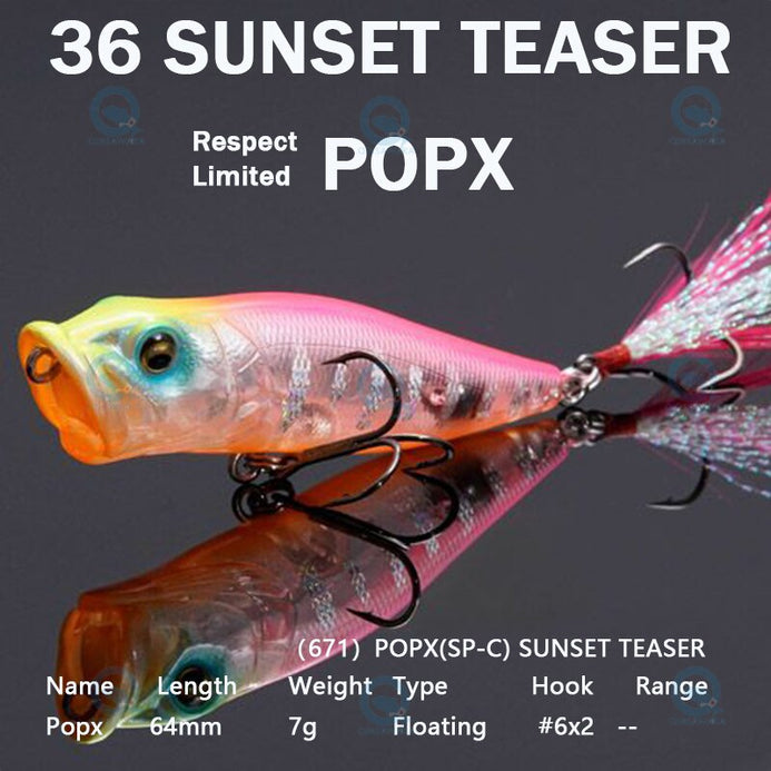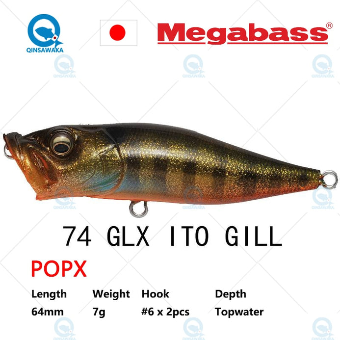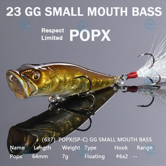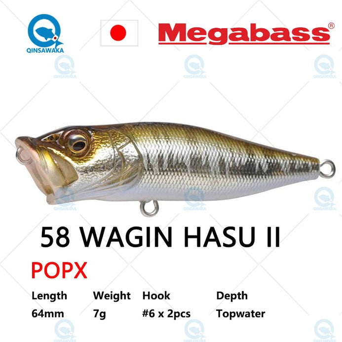 Introduced in 1996,POPX continues to dominate the high-end top-water bait markets of both Japan and the United States. Equipped with MEGABASS original SIDE-STEPPING BALANCER(PAT),POPX walks a rolling dog-walk unlike any other poppers, and the WATER DUCTS(PAT)which imitate the bubbly water coming out of gills and help create a natural"bio-sound", not an ordinary popping sound. POPX also spits, not splashes, quite a distance.